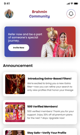 Take a closer look at the Brahmin Community App! Our clean and modern design makes it easy to explore profiles, connect with members, and communicate securely. Every feature is thoughtfully designed to offer a smooth and meaningful experience — keeping you connected with your community anytime, anywhere.